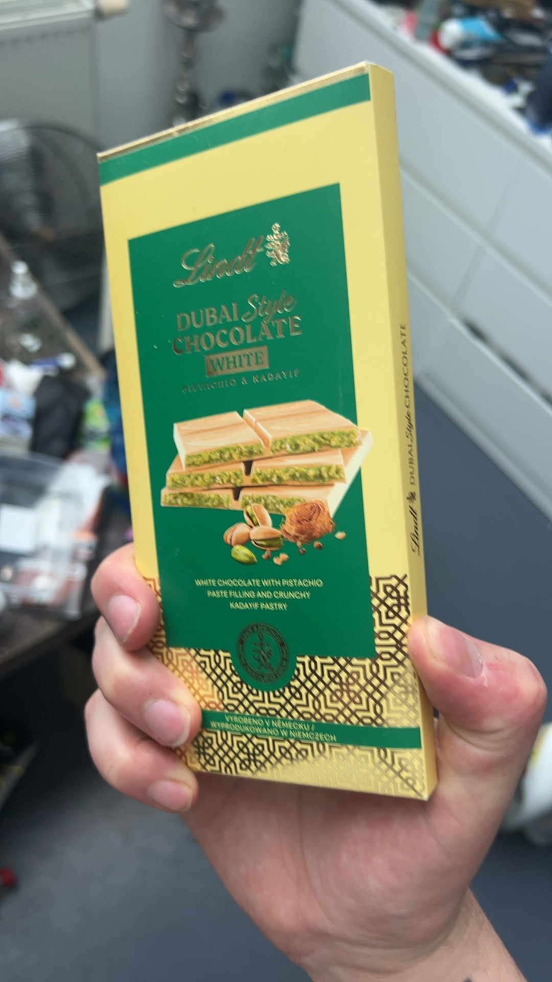 White chocolate bar with pistachio paste filling and crispy kadaif pastry. Weight: 150g. The name "Dubai Style Chocolate" refers to the combination of flavors (pistachio + kadaif), not the origin.